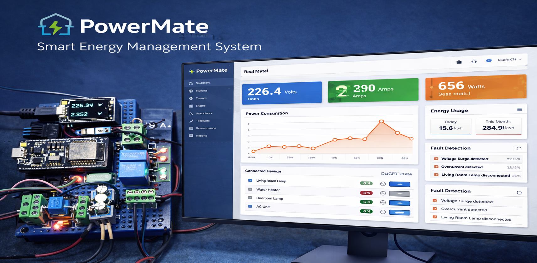 PowerMate is an IoT-based smart energy monitoring and control system designed to optimize power consumption and improve energy efficiency.